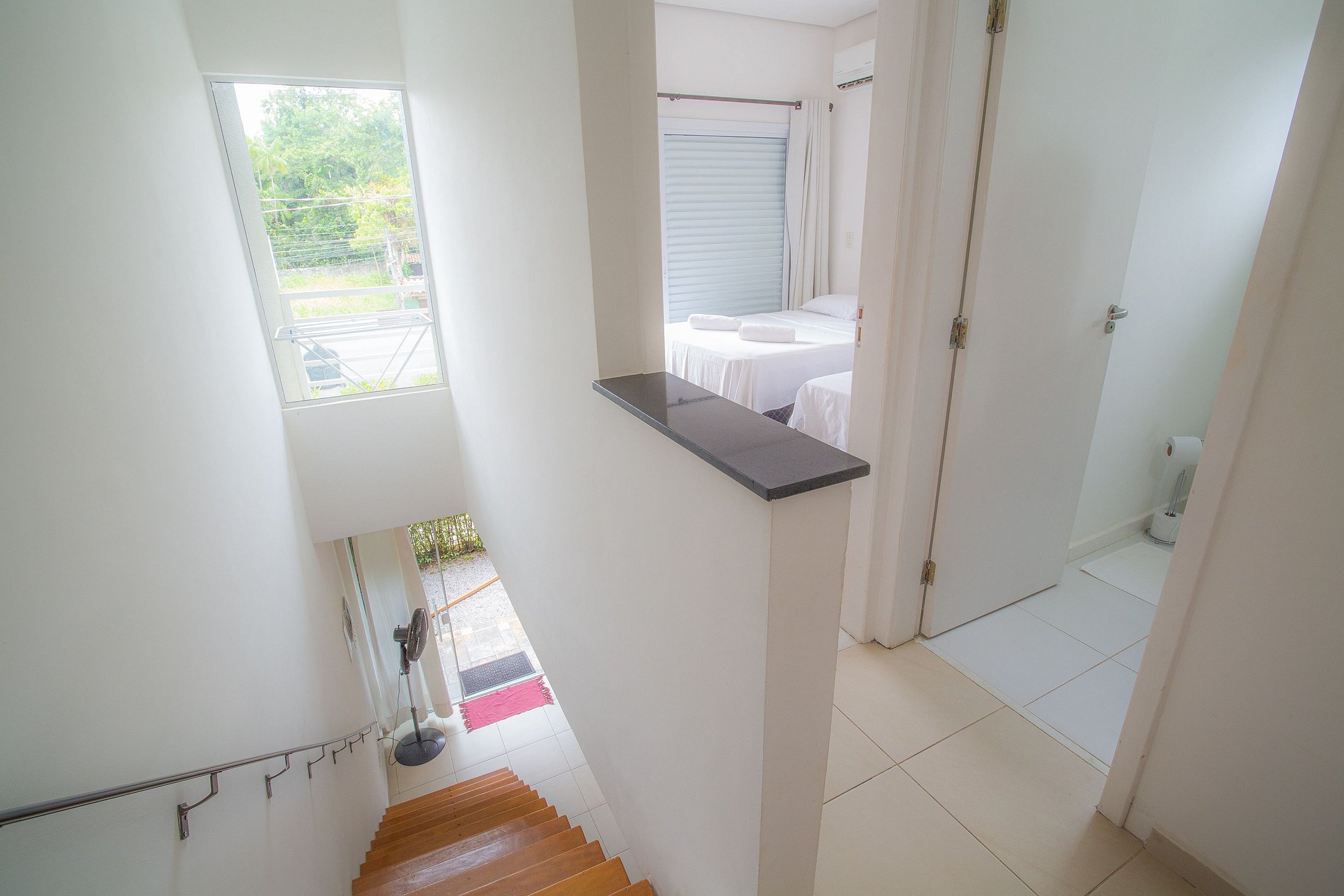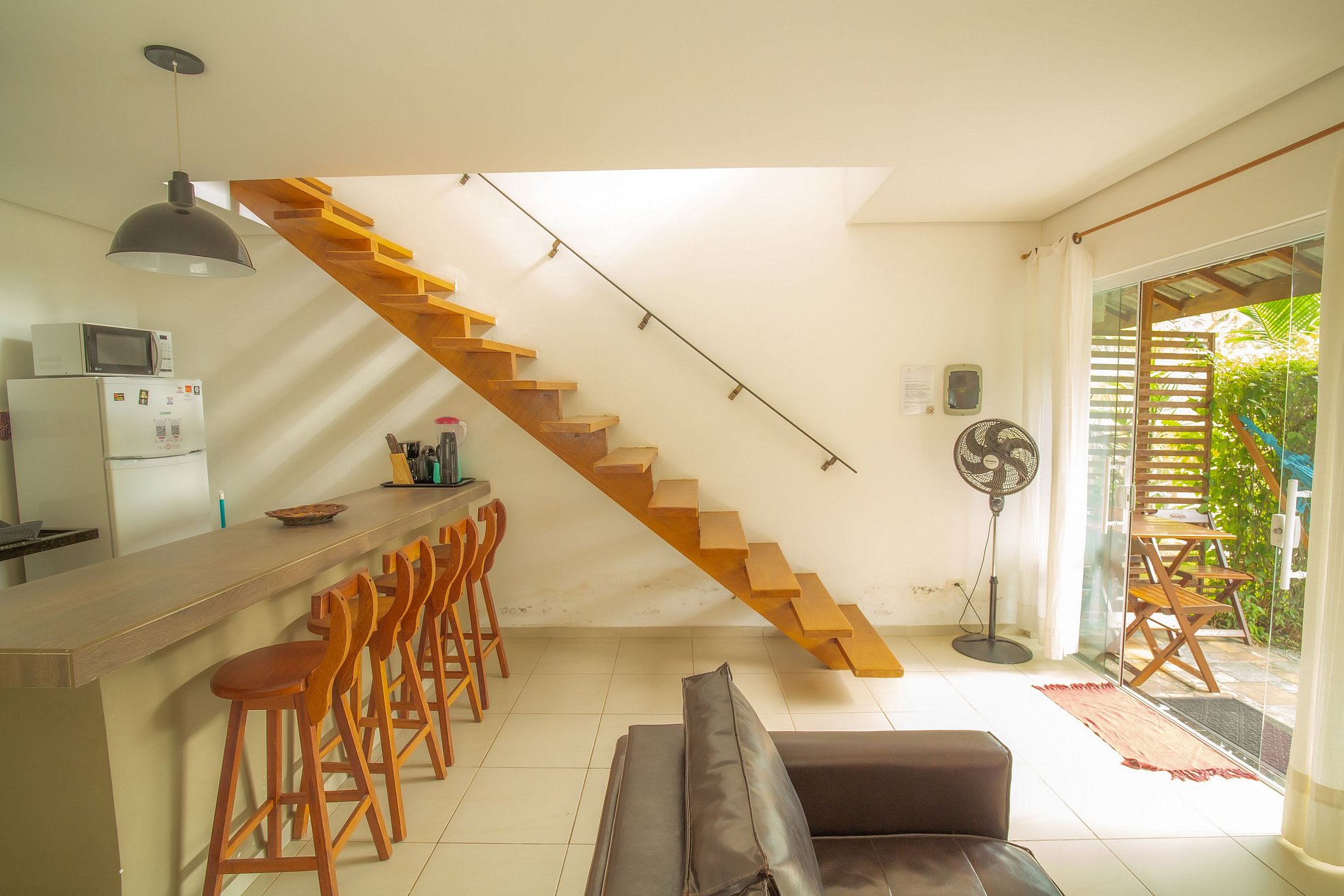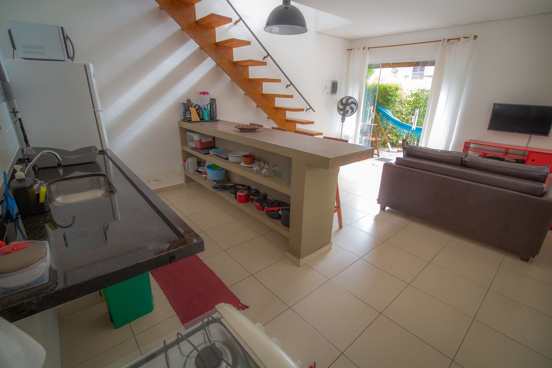 A casa possui o dormitório com ar condicionado (cama de casal e bicama de solteiro) e o banheiro no piso superior, e no térreo fica a sala com ventilador, a cozinha e o quintal super aconchegante onde é possível descansar na rede e fazer um delicioso churrasco na volta da praia. Ah, também possui filtro de água para sua comodidade!