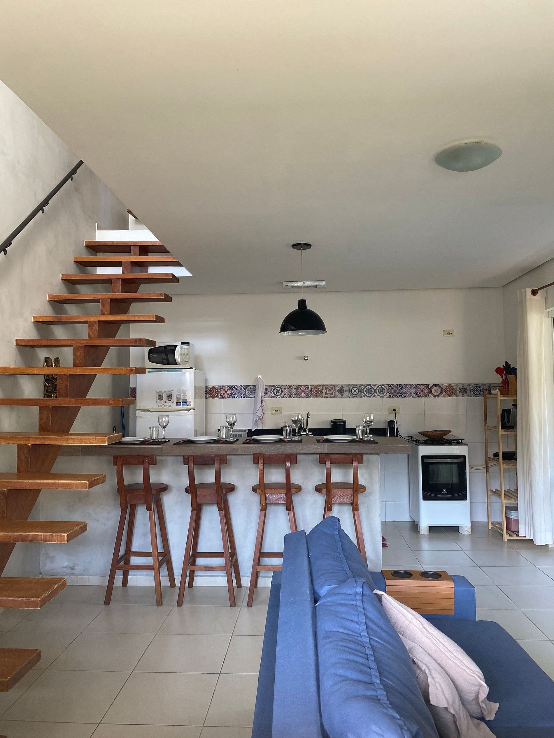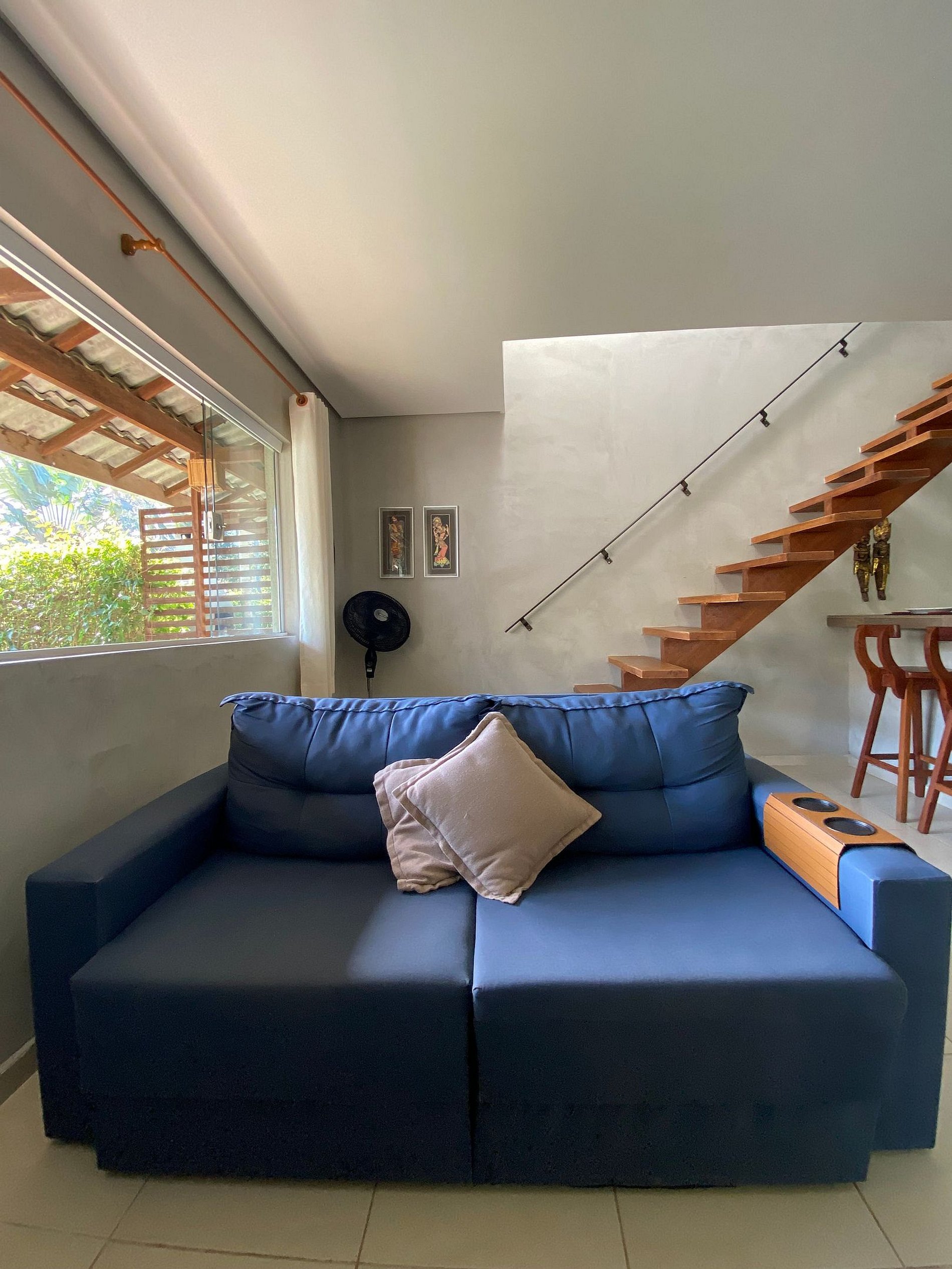 A casa possui o dormitório com ar condicionado (cama de casal e bicama de solteiro) e o banheiro no piso superior, e no térreo fica a sala com ventilador, a cozinha e o quintal super aconchegante onde é possível descansar na rede e fazer um delicioso churrasco na volta da praia. Ah, também possui filtro de água para sua comodidade!