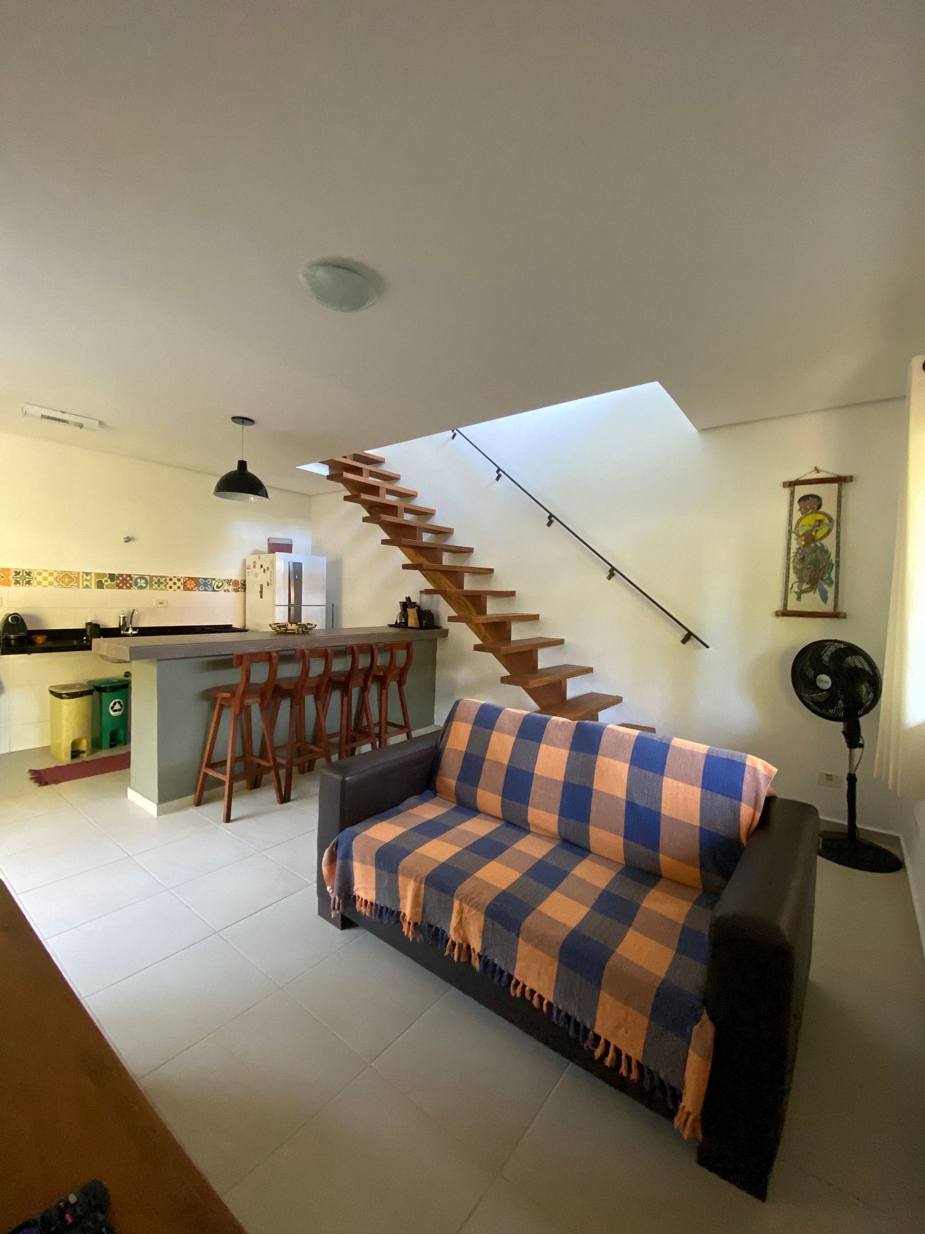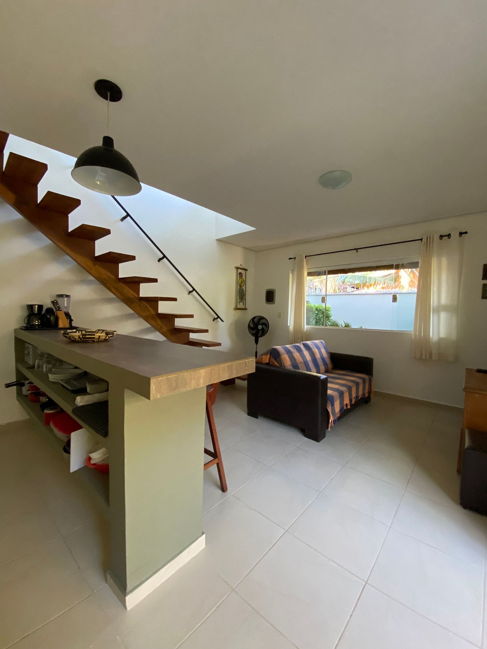 A casa possui o dormitório com ar condicionado (cama de casal e bicama de solteiro) e o banheiro no piso superior, e no térreo fica a sala com ventilador, a cozinha e o quintal super aconchegante onde é possível descansar na rede e fazer um delicioso churrasco na volta da praia. Ah, também possui filtro de água para sua comodidade!